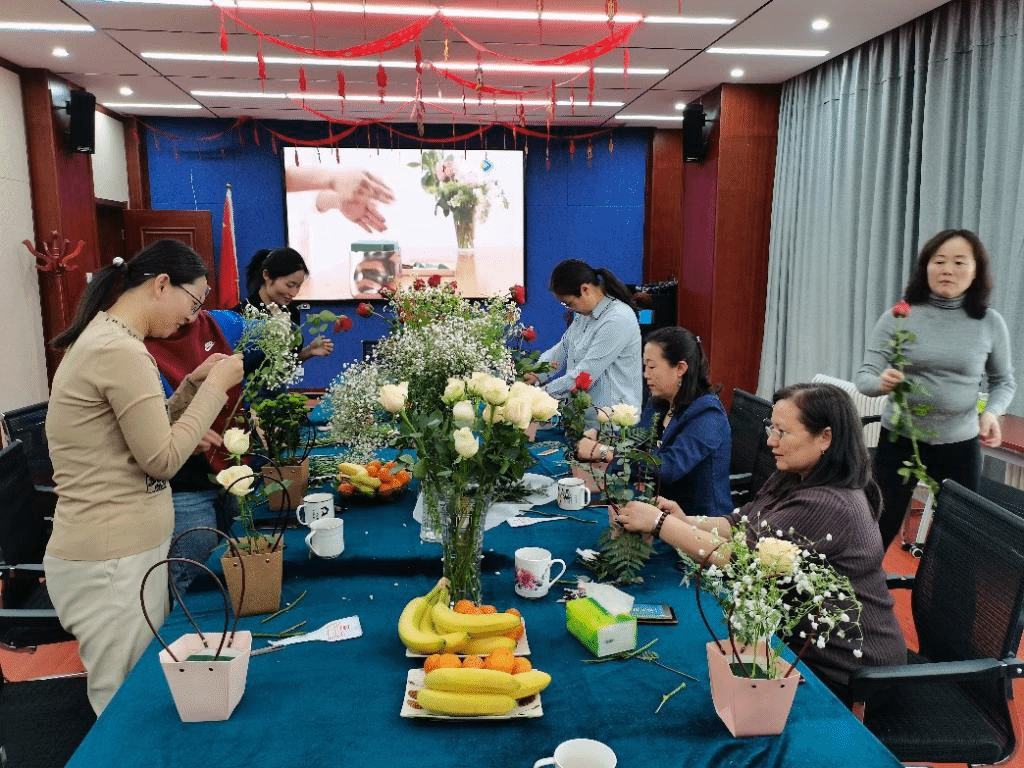 女教职工们对插花艺术兴趣盎然,运用所学知识、经过巧妙的创意组合,制作出一束束生机盎然、疏密有致的插花作品。通过插花制作,让女教职工们感受到了插画制作的快乐。更借用花草来抒发女员工的高雅情怀,以花感人,以花育人。