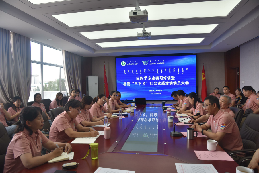 2021年7月6日下午3:00,千亿国际网页版登录民族学专业实习培训暨田野调查动员大会在千亿国际网页版登录607会议室隆重召开。纳日碧力戈教授、党总支书记包凤兰、院长乌日陶克套胡、副书记副院长阿荣、赵树冈教授、系主任张昆、行政教辅老师、各带队员工、2019级民族学全体本科生及部分研究生参加了会议。会议由满达副院长主持。