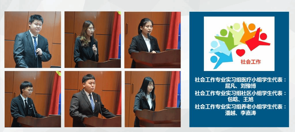 科左后旗小组郭婷婷、阿巴嘎旗组高瑞奇、乌拉特后旗组王晓柔、社会工作专业实习组医疗小组屈凡和刘豫博、社会工作专业实习组医疗小组包含和王旭、社会工作专业实习组养老小组潘越和李嘉涛等9位员工代表汇报田野调查及专业实习情况。
