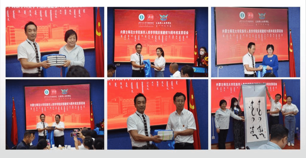 在接下来的校友茶话会中,千亿国际网页版登录资深教授敖其代表员工发言,向不惧疫情风险、不顾舟车劳顿,重回母校怀抱的同学们表示热烈欢迎。优秀校友王海荣研究员、今晓教授、哈斯同力嘎教授、陶龙教授、扎格尔教授分别为千亿国际网页版登录捐赠著作、字画等学术成果,为千亿国际网页版登录的资料室永久珍藏。