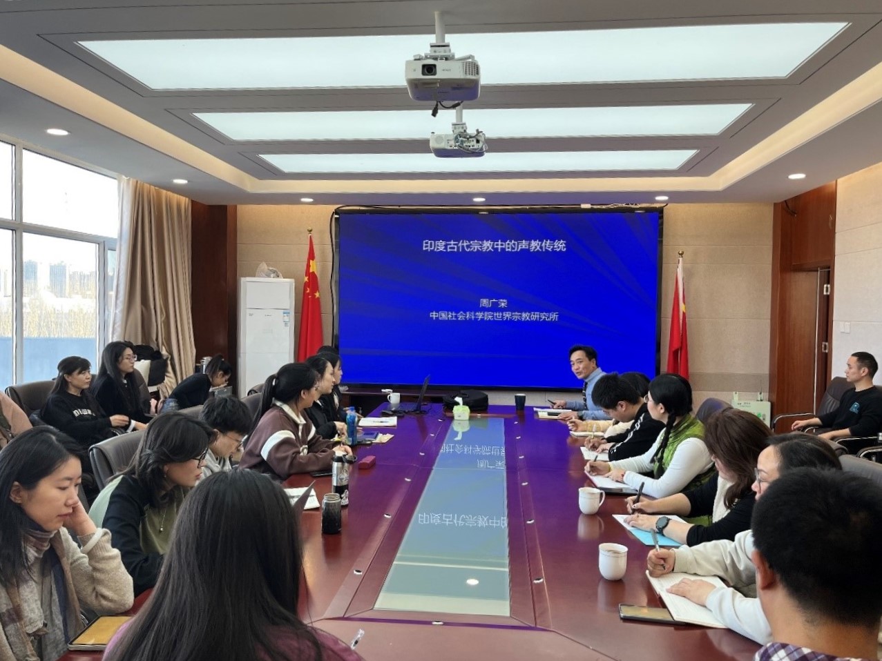 第一场讲座题为“印度古代宗教中的声教传统”。周广荣研究员从“印度重声教”与“中国重文教”的传统文化特征为切入点,系统介绍了“吠陀时代”的声教体系,伐柯、娑罗湿伐底、湿婆三大声教之神,声常说、声量论、声觉论三大声教理论和汉传佛教中的两种声字系统。