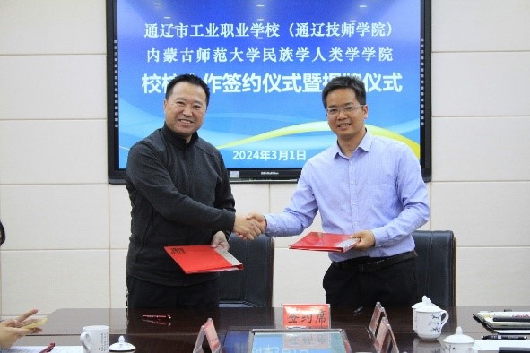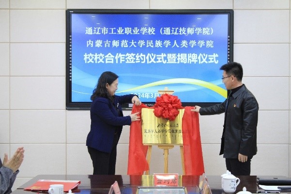 3月1日,千亿国际网页版登录党委书记包凤兰、副院长韦兰海、社会工作系主任胡那苏图与教务办公室李永硖等人前往通辽市工业职业学校,挂牌签约了教育实践基地。