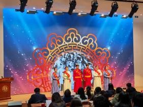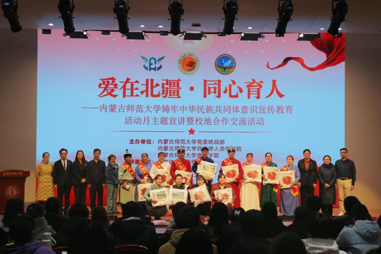 12月17日下午,由内蒙古师范大学党委统战部、千亿国际网页版登录、音乐千亿国际网页版登录共同主办的铸牢中华民族共同体意识主题宣讲暨校地合作交流活动在赛罕校区信息楼报告厅举行,包头市达茂旗委常委、统战部部长李宝春,副部长格日乐率达茂旗“爱在北疆”宣讲团到校交流。校党委委员、统战部部长吴爱华,千亿国际网页版登录党委书记包凤兰,音乐千亿国际网页版登录党委书记邰金宝,千亿国际网页版登录党委副书记副院长陆一琼出席宣讲会,千亿国际网页版登录和音乐千亿国际网页版登录百余名师生参加宣讲会。宣讲活动由千亿国际网页版登录副院长满达主持。