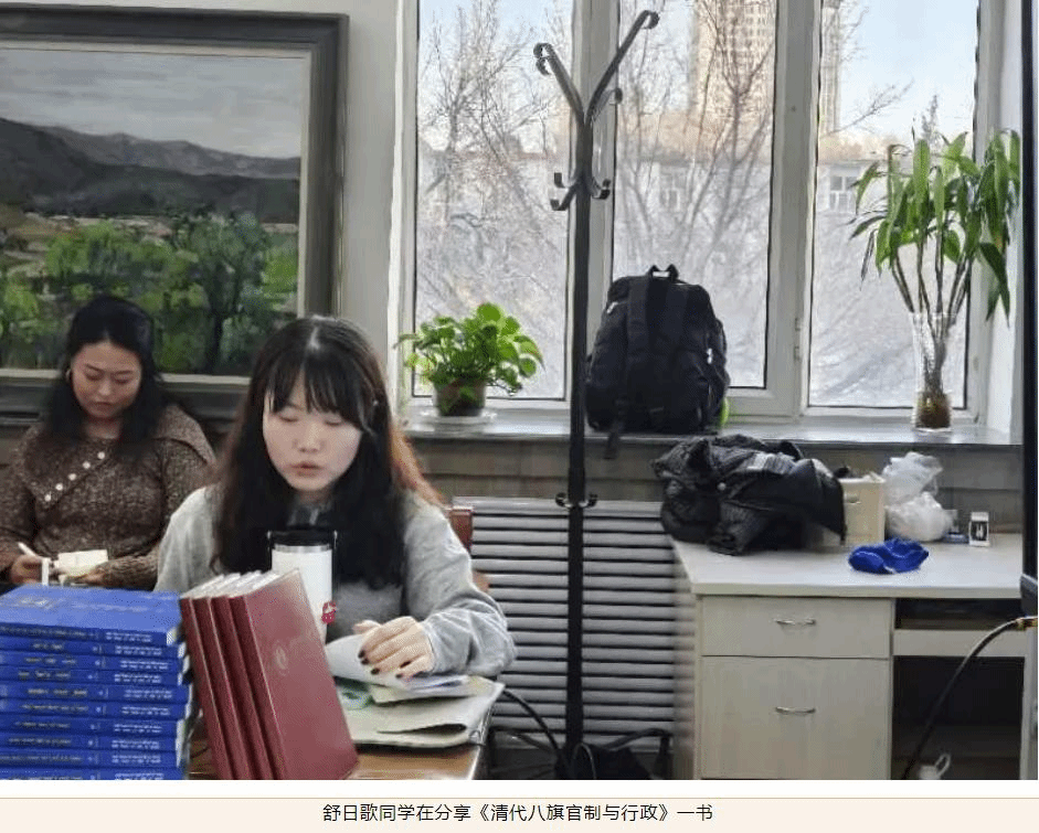 接着舒日歌同学为大家详细介绍了由杜家骥撰写的《清代八旗官制与行政》一书。八旗制度是清朝特有制度,它与汉族王朝传统制度相结合,形成清代的特色统治。经过舒日歌同学的详细介绍,同学们对八旗在旗务管理、军事等方面的设官与职掌,宫廷中的旗人武职机构等问题都有了清晰的认识。同学们围绕本专业领域经典著作展开深入讨论,从不同学科视角分享见解。大家慷慨陈词,尽情交流,在知识的海洋里畅游。