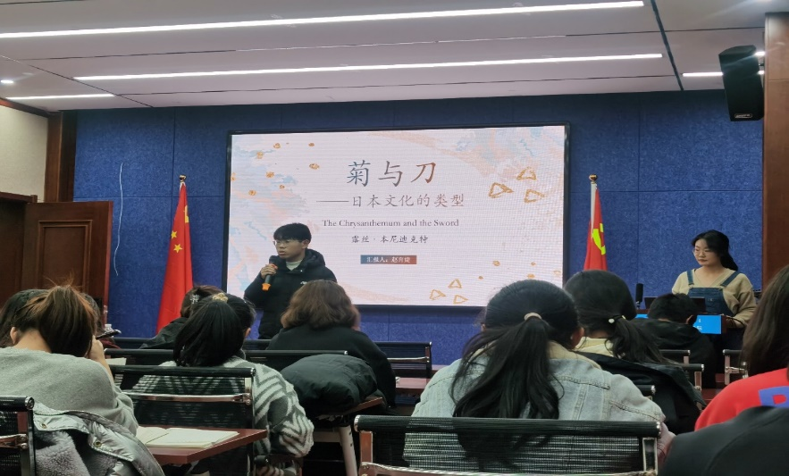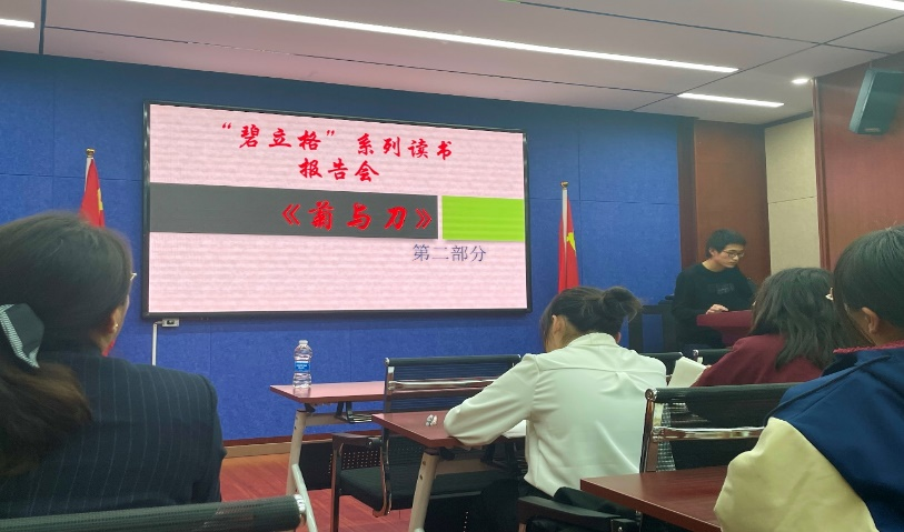 11月19日傍晚19:00,千亿国际网页版登录2021级本科班在田楼615会议室开展了第三期“碧立格”读书报告会,指导老师包美丽、班主任云中老师莅临现场,梁东新同学主持活动,由赵育婕同学和张学毅同学主讲本尼迪克特的著作《菊与刀》。