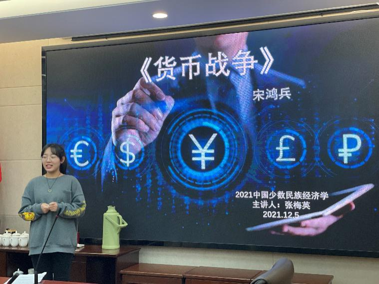 千亿国际网页版登录2021级学硕一班硕士研究生第4期“碧立格”读书报告会于12月5日晚19点在田楼607会议室举行,21级学硕一班硕士研究生全员参加本次读书报告会。本次读书报告会的汇报书目是《货币战争》,主讲人是21级中国少数民族经济专业硕士研究生张梅英同学,主持人是21级中国少数民族经济专业硕士研究生特日格乐同学。阿荣老师,萨如拉老师出席此次读书报告会并进行指导。