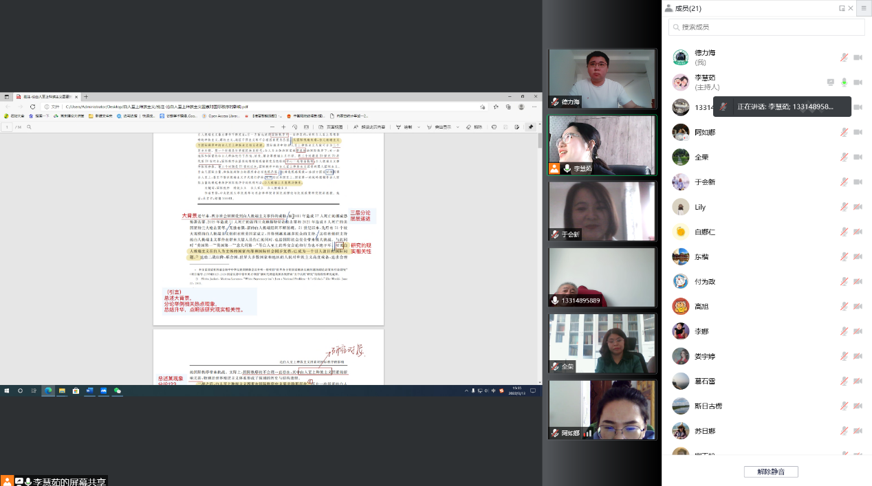 2020级民族理论与政策博士生李慧茹同学精读的论文为《论白人至上种族主义因素对国际秩序的影响》,选自《民族研究》2021年第5期。李慧茹同学在论文中做了详细的批注和阅读笔记,带领着大家一步一步分析摘要、关键词、引言、正文和结语的写作思路与行文逻辑,环环相扣。同时提出,在阅读理论性文章时,既要看到表面研究的具体问题,更要深挖论文背后研究的理论层面问题,这样才能读的深刻,理解的透彻。