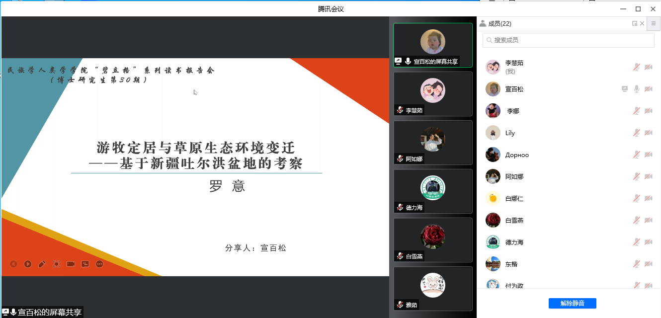 宣柏松同学分享的论文为《游牧民定居于草原生态环境变迁—基于新疆吐尔洪盆地的考察》(《民族研究》2020年第5期)一文。宣柏松同学首先对生态人类学、学术研究前沿进行介绍,并从问题意识中入手向各位同学分享自己的阅读感想。同时拓展自己研究思路、引发论文写作的思考,值得肯定。