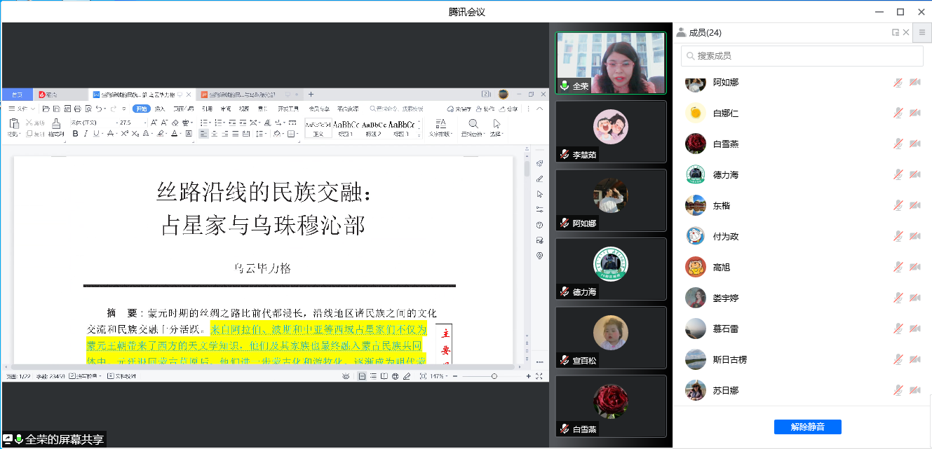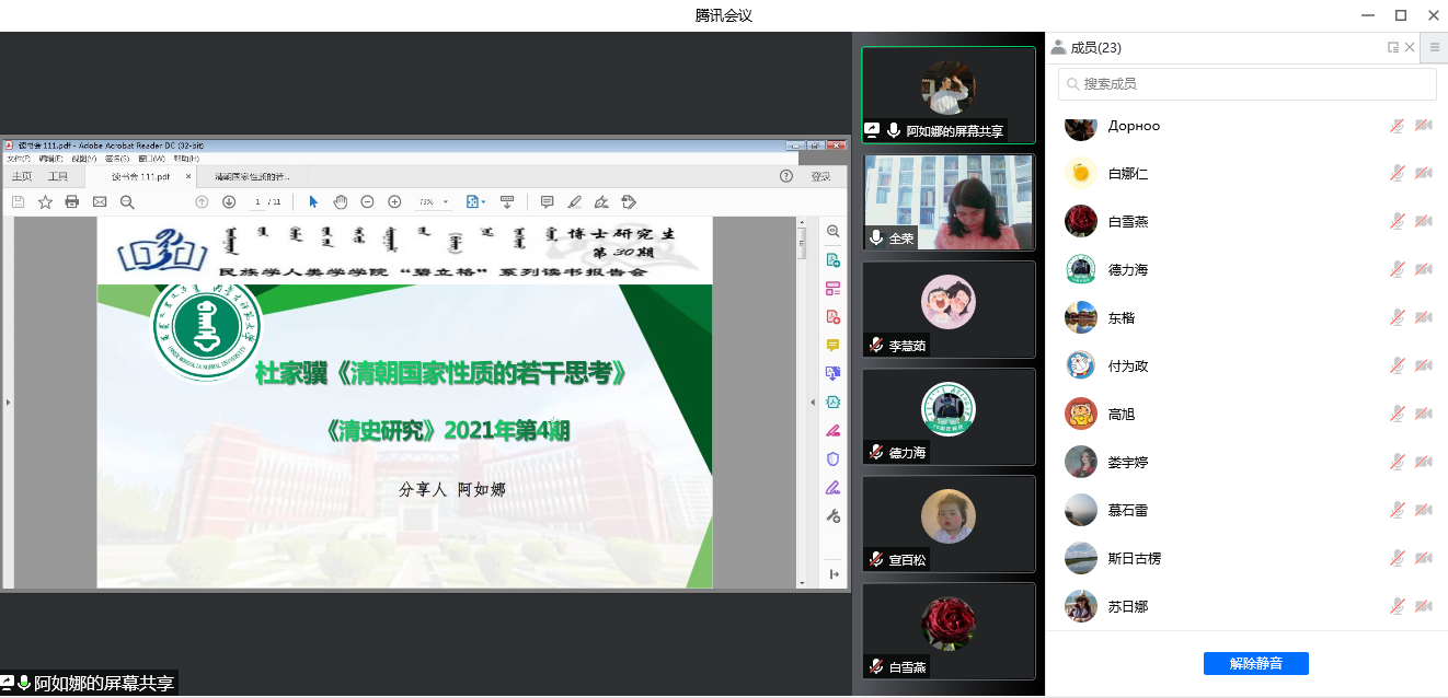 2022年3月20日下午3:00,千亿国际网页版登录2020级、2021级博士研究生通过“腾讯会议”举行了第30期读书报告会。本次读书报告会的汇报者是中国少数民族史专业的全荣、阿如娜、宣柏松等3位博士生。博士生导师胡日查教授出席本次读书报告会并进行指导,2020级博士生李慧茹主持本次读书报告会。