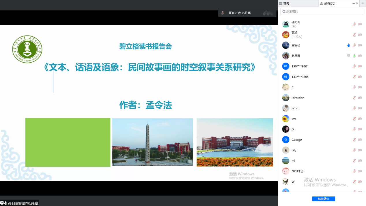苏日娜同学分享的论文是《文本、话语及语象:民间故事画的时空叙事关系研究》,发表于《民族文学研究》2021年第3期。主要对论文作者、相关研究背景、论文内容、个人反思和拓展阅读文献等几部分做了分享。分享者首先对叙事学研究和畲族的长联故事画做了简要介绍,之后从文本制作——行为、人物及互动交流过程,话语——故事时间与图像空间,语像——“时间的空间化”与“空间的时间化”三个方面重点介绍了文章的主要内容。图像作为叙事行为的一种载体,迥异于话语叙事的顺时性空间叙事模式,而文字叙事在某种程度上虽也具有空间叙事性,但更依赖于线性发展的时间创作手段。话语或文字的图像转译反映了时间向空间的移动,而图像之所以能叙事,则表现了空间对时间的回归,即对话语或文字解读功能的实践。任何图像都有其创作背景和使用语境,所以对文本语境的还原是阐释图像叙事及其创作机制的基础,而对生活语境的探查则是理解图像叙事之于其实践者的意义和价值的关键。