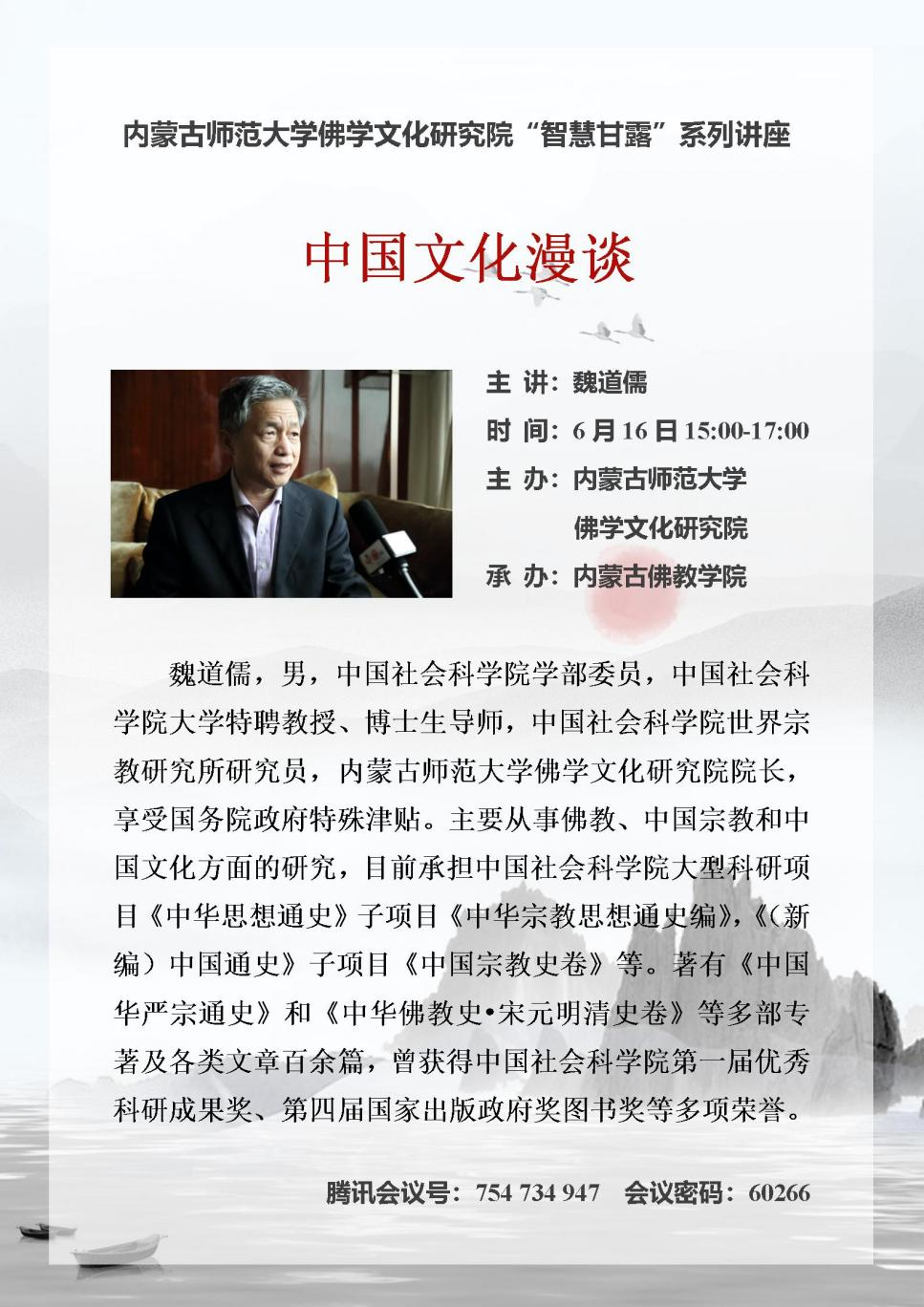6月16日下午,中国社会科千亿国际网页版登录学部委员、我校佛学文化研究院院长魏道儒先生应邀做客“智慧甘露”系列讲坛,在线上为千亿国际网页版登录师生做了题为“中国文化漫谈”学术讲座。讲座由副院长满达主持,宗教学专业全体师生及内蒙古佛教千亿国际网页版登录院长布仁满都拉等全体师生聆听了讲座。